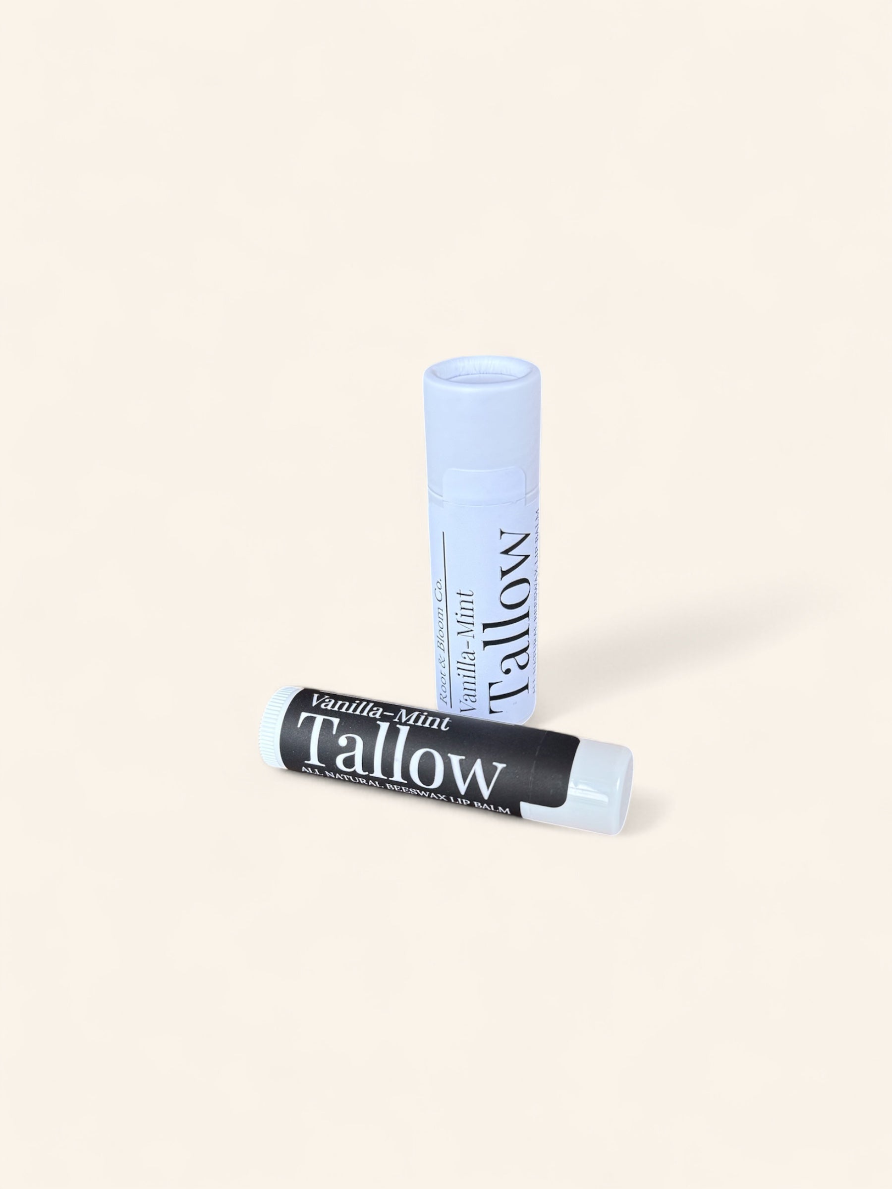 Our Vanilla Mint Tallow Lip Balm is a rich and smooth formula designed to deeply nourish and protect your lips. Infused with the warm, inviting aroma of vanilla and a hint of cooling mint, this luxurious balm melts on contact, providing hydration and a silky-soft finish. Perfect for daily use, it helps restore moisture while leaving your lips irresistibly smooth and naturally radiant. Crafted with locally sourced, grass-fed tallow that’s been infused with organic fair trade vanilla beans, our balm delivers an artisanal touch that elevates your lip care routine.